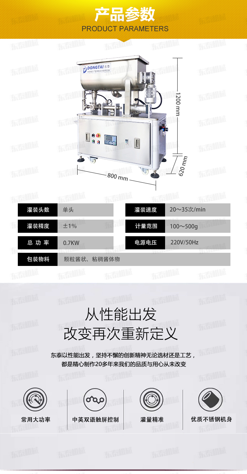 半自動灌裝機械,配置的自動攪拌器,保證了醬和油的充分混合,可灌裝顆粒漿狀流體物料在對辣椒醬、拌面醬、豆鼓等醬類進行灌裝時,灌裝量可在規定范圍內任意調節,計量誤差小,該半自動醬類灌裝機采用壓縮空氣為動力可在各種環境中使用。