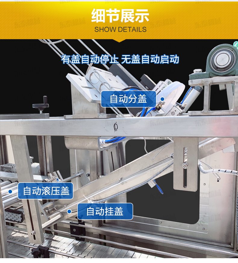 操作:人工放蓋到料倉,機器自動定位、自動落蓋、自動掛蓋、自動滾蓋