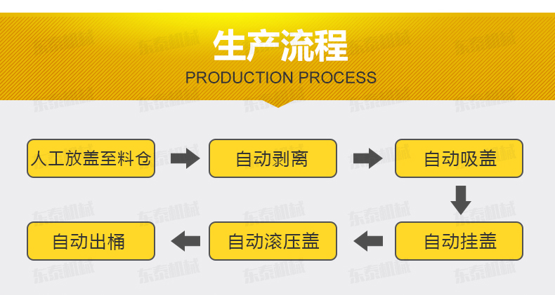 人工放蓋至料倉——自動剝離——自動吸蓋——自動掛蓋——自動滾壓蓋——自動出桶——一個循環完成。