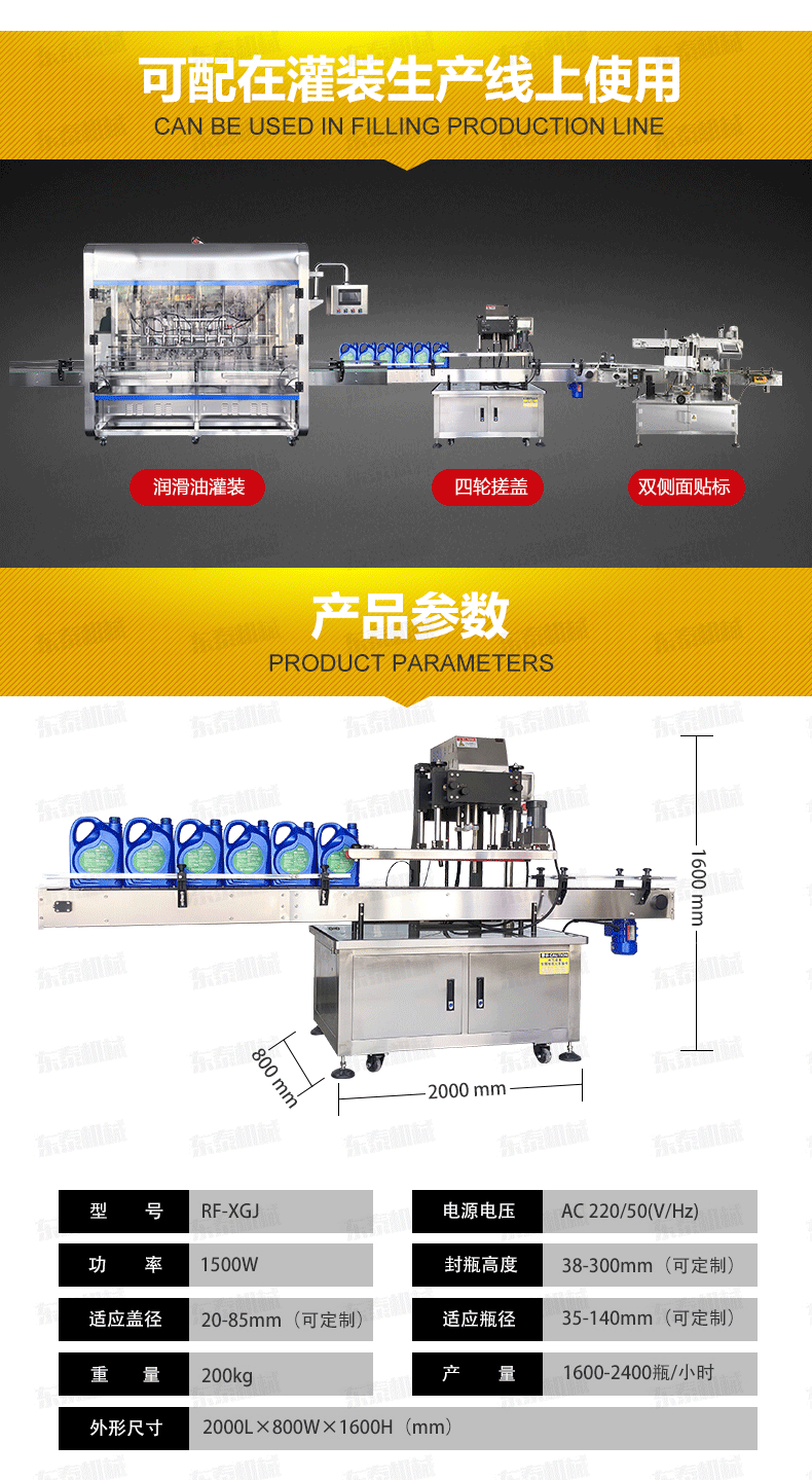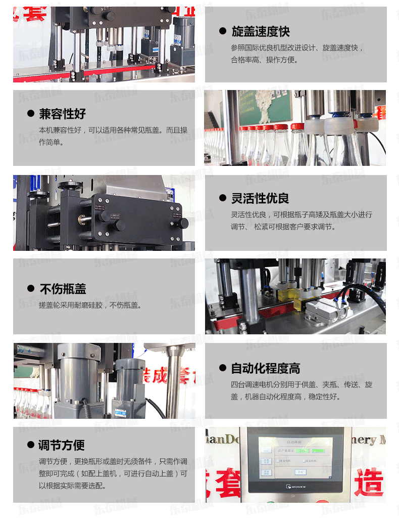 全自動旋蓋機是參照國機型改進設計、旋蓋速度快,合格率高、操作方便?蛇m用于食品、制藥、日化、農藥、化妝品等行業的不同瓶形的旋蓋。四臺調速電機分別用于供蓋、夾瓶、傳送、旋蓋,機器自動化程度高,穩定性好,調節方便,更換瓶形或蓋時無須備件,只需作調整即可完成(如配上蓋機,可進行自動上蓋)可以根據實際需要選配。