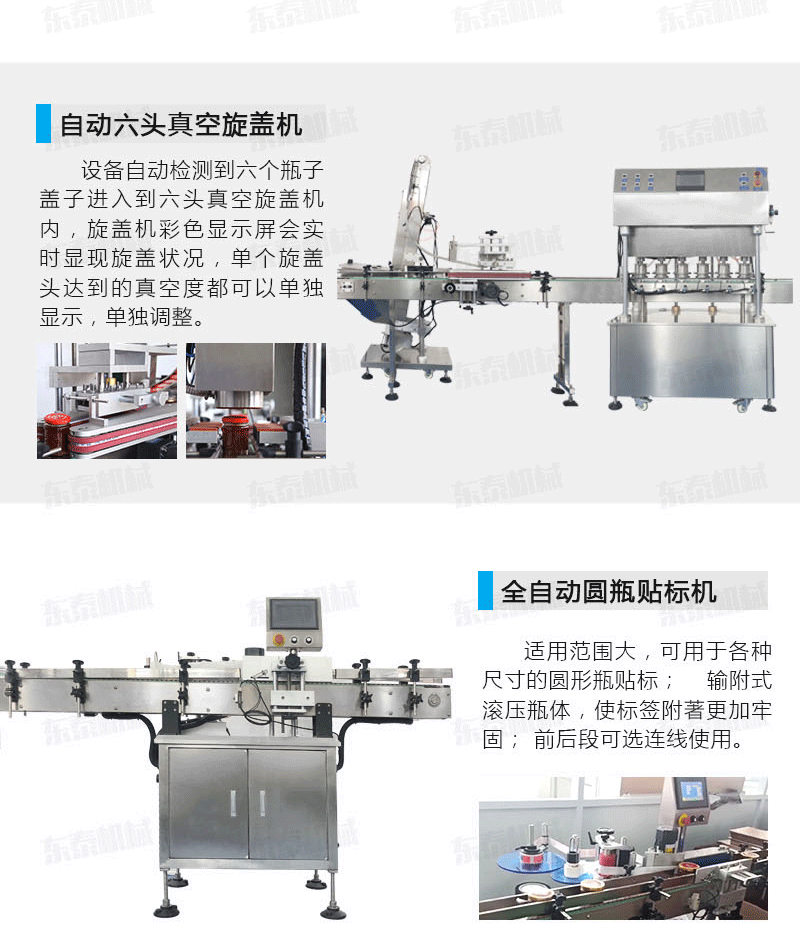 番茄醬灌裝旋蓋生產設備組成: 自動供瓶機+全自動滾筒洗瓶機+自動六米烘干機+自動收瓶機+全自動六頭灌裝機自動灌裝+全自動提蓋機自動理蓋、提蓋、掛蓋+六頭真空旋蓋機同時六個頭真空旋蓋+套標機+收縮