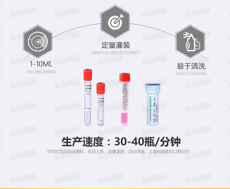 本機是在引進和吸收國外技術的基礎上,由我公司自主研發的一款IVD診斷試劑灌裝旋蓋一體機,能同時完成自動理瓶、自動上瓶、定量灌裝、自動理蓋、上蓋和旋蓋封口等動作。本機采用日本高精度封閉式凸輪分度工位器,精度高,運行可靠,使用壽命長。該分度器結構簡單,長期使用無需維修。該型號設備主要用于ⅣD體外診斷試劑制藥、生物制藥行業及科研領域裝。機器設計緊湊合理、外形簡潔美觀,灌裝量調節方便。