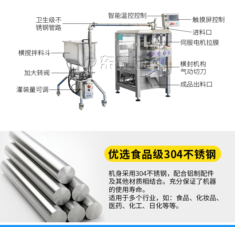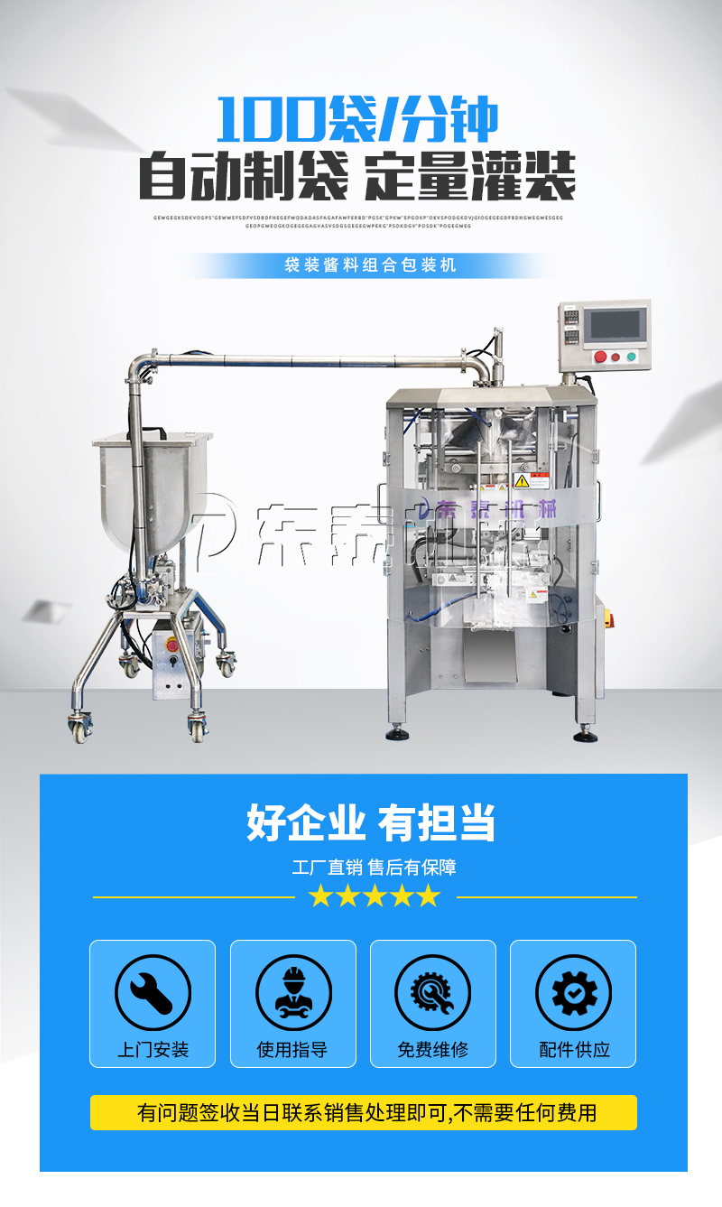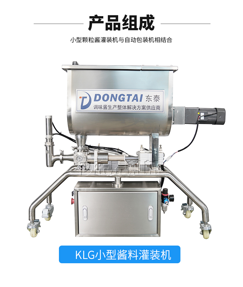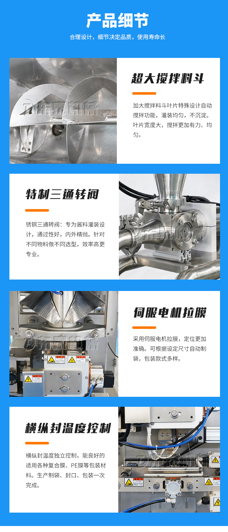 本機器主要用于調味品醬料的自動化包裝,機器安裝有橫向螺帶式攪拌,使油醬混合均勻,確保灌裝精度和產品包裝成品的均勻性。灌裝計量設備安裝有萬向輪,管路鏈接均采用快拆接頭,方便灌裝機拆卸移動清洗。包裝設備采用全伺服驅動器,包裝速度快,運行穩定。