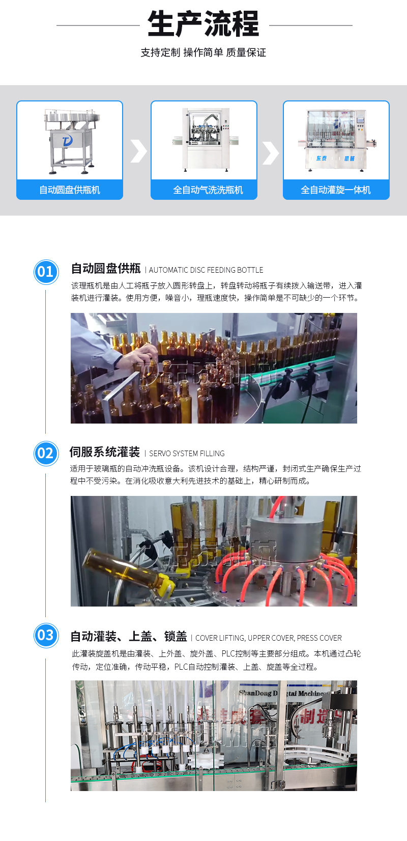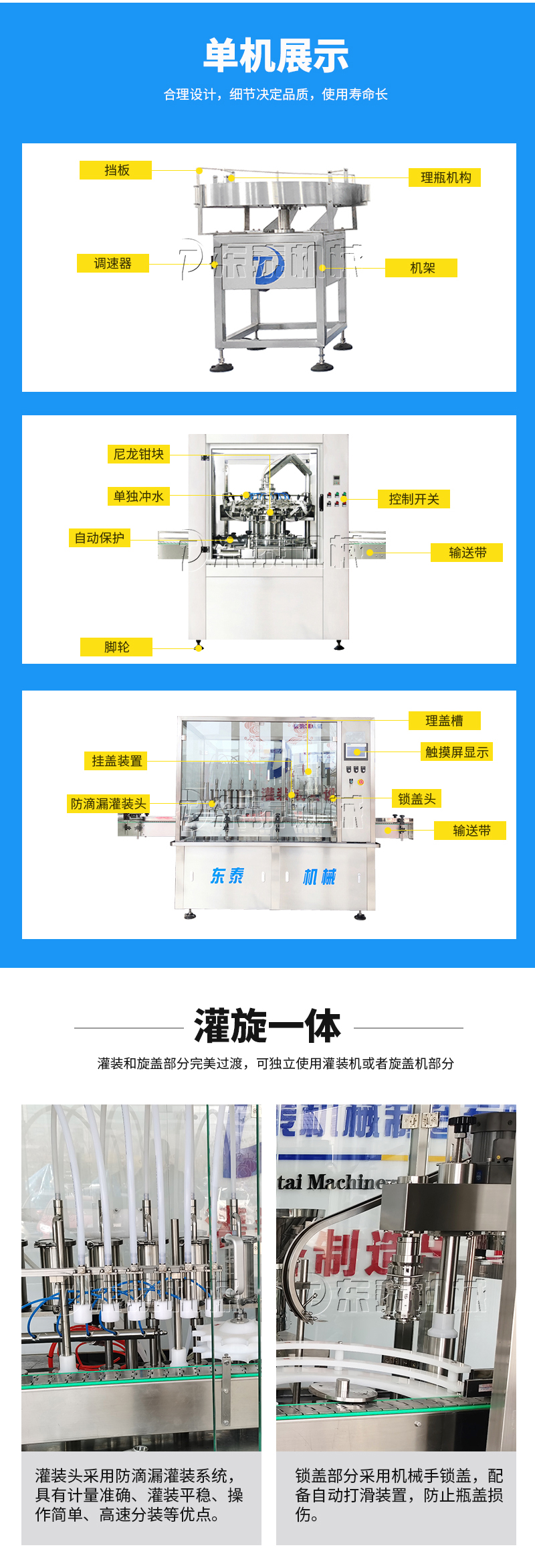 本灌裝流水線設(shè)備具有穩(wěn)定可靠、自動(dòng)化水平高,相比同類產(chǎn)品有著更長的使用年限,維護(hù)簡(jiǎn)單,整線中各設(shè)備的協(xié)調(diào)性、連貫性強(qiáng),整線設(shè)計(jì)合理等特點(diǎn)。灌裝設(shè)備采用獨(dú)家專利系統(tǒng)結(jié)構(gòu),為當(dāng)今行業(yè)內(nèi)水平,整