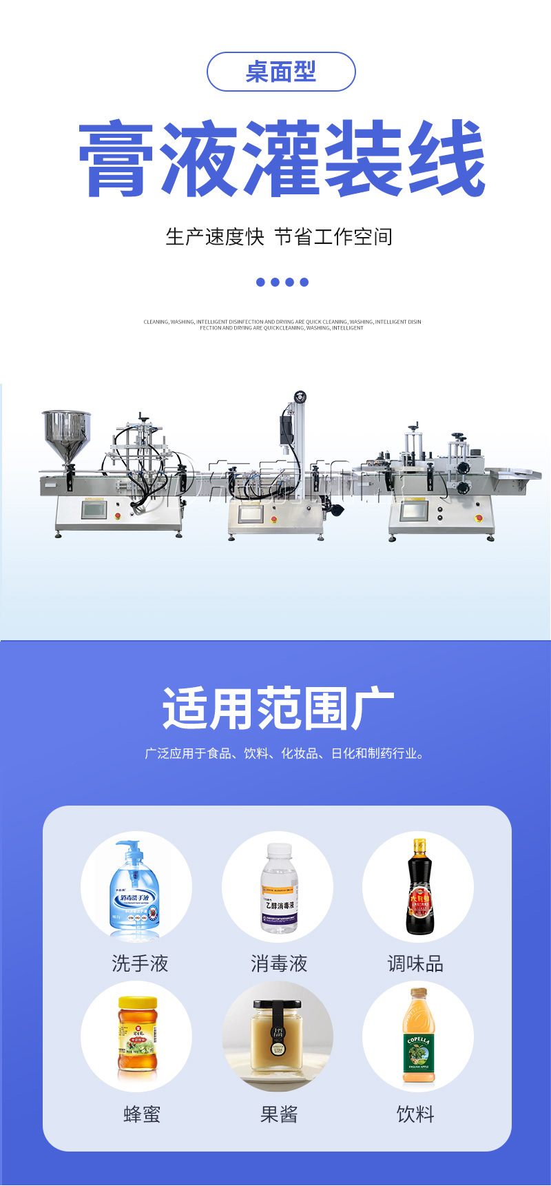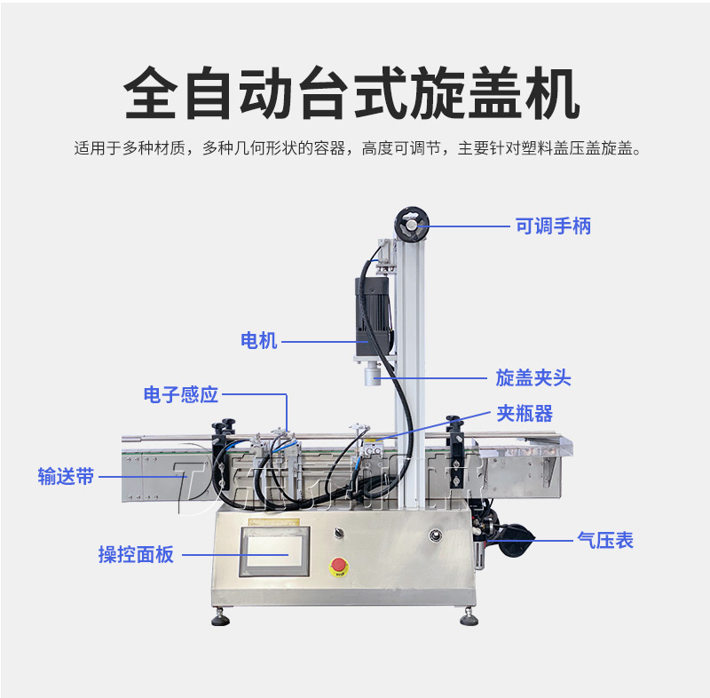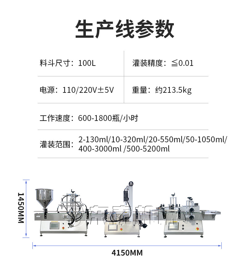 產(chǎn)品說明:生產(chǎn)線根據(jù)灌裝范圍選擇型號,灌裝部分為雙頭下潛式灌裝機,適用于不同物料不同瓶子的灌裝,配備自動壓蓋機和圓瓶貼標機,可實現(xiàn)不同蓋子的旋蓋貼標工作。 本設備主要適用于食品、日常化工