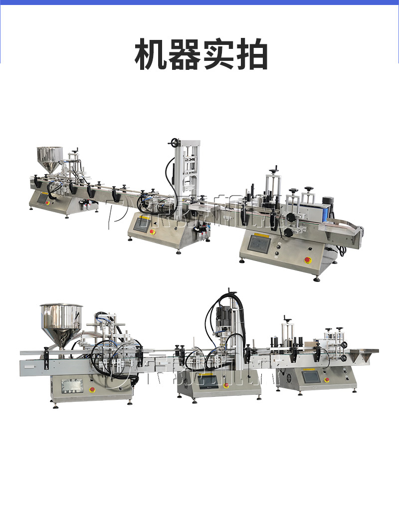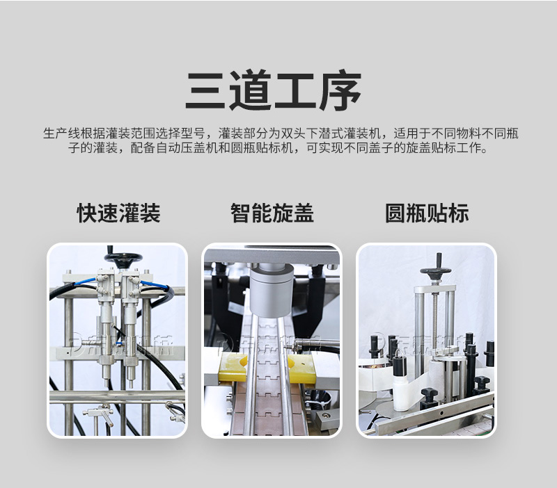 產(chǎn)品說明:生產(chǎn)線根據(jù)灌裝范圍選擇型號,灌裝部分為雙頭下潛式灌裝機,適用于不同物料不同瓶子的灌裝,配備自動壓蓋機和圓瓶貼標機,可實現(xiàn)不同蓋子的旋蓋貼標工作。