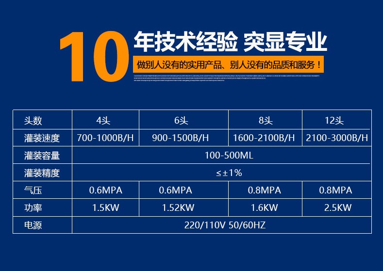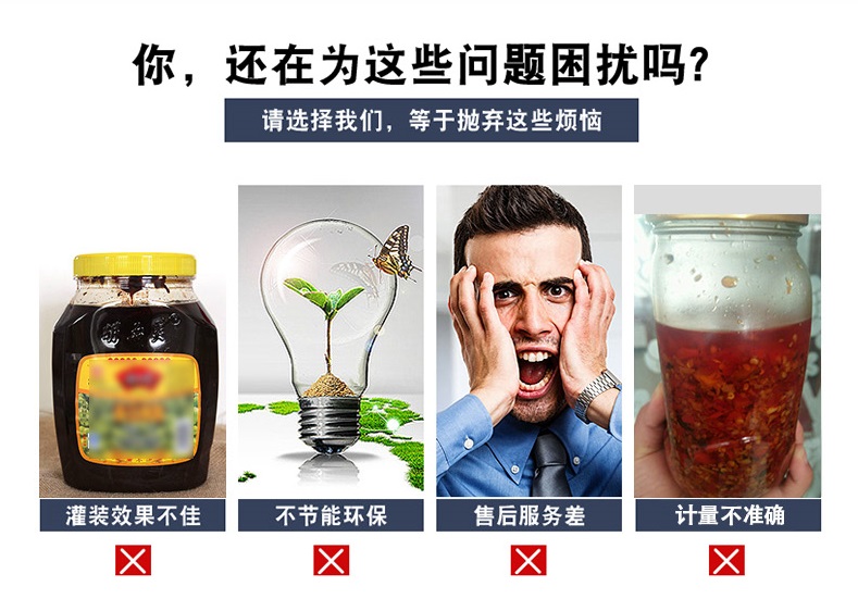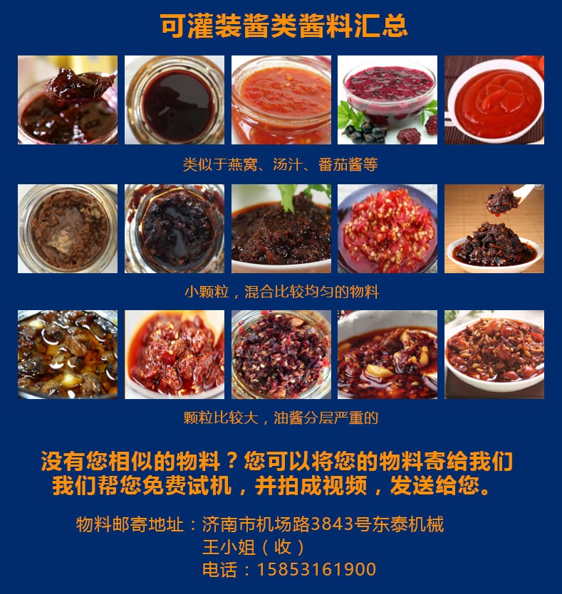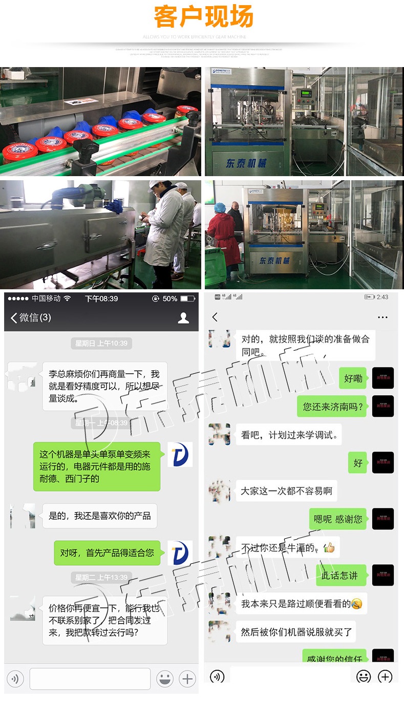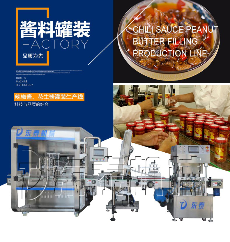 該生產線適合中小口徑三旋、四旋玻璃瓶調味醬的分裝,適合醬料、含顆粒黏稠物料的灌裝,物料接觸部分均采用316不銹鋼,整機304不銹鋼,符合食品衛生標準。該機設計合理,機型小巧,立式結構,節省場地,操作方便。啟動部分均采用德國FESTO和臺灣AirTack的氣動元件。灌裝閥有氣動閥控制,灌裝精度更高,灌裝量和灌裝速度均可任意調整,灌裝悶頭采用防拉絲及升降灌裝裝置。