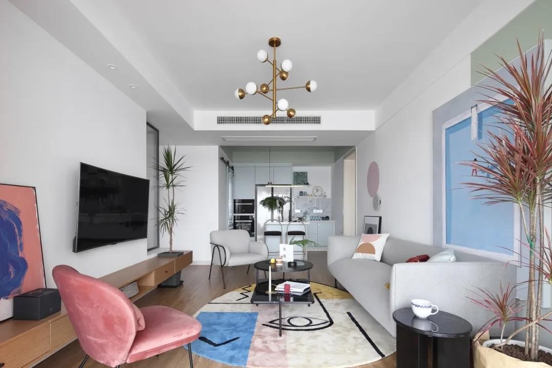 粉色休閑椅、在掛畫與地毯、綠植也是加入了粉色的元素,使得簡約的空間更加浪漫雅致。頂上一盞金屬色的吊燈,則是增添了空間的華麗檔次感